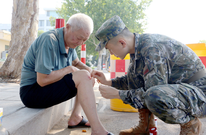 “先把老人移到阴凉处!”随后赶至现场的指导员徐彬彬与官兵搀扶起意识模糊的老人,将其转移至营区门口的树荫下休息。卫生员迅速铺开急救包,在轻声安抚老人情绪、征得同意后,先用生理盐水仔细冲洗膝盖处的擦伤,清除伤口内的泥沙杂质,再用碘伏轻柔而专业地消毒。另一边,徐彬彬蹲在老人身边耐心沟通,一点点引导老人回忆家属联系方式,同时联系辖区派出所请求协助,确保救援环节无缝衔接。